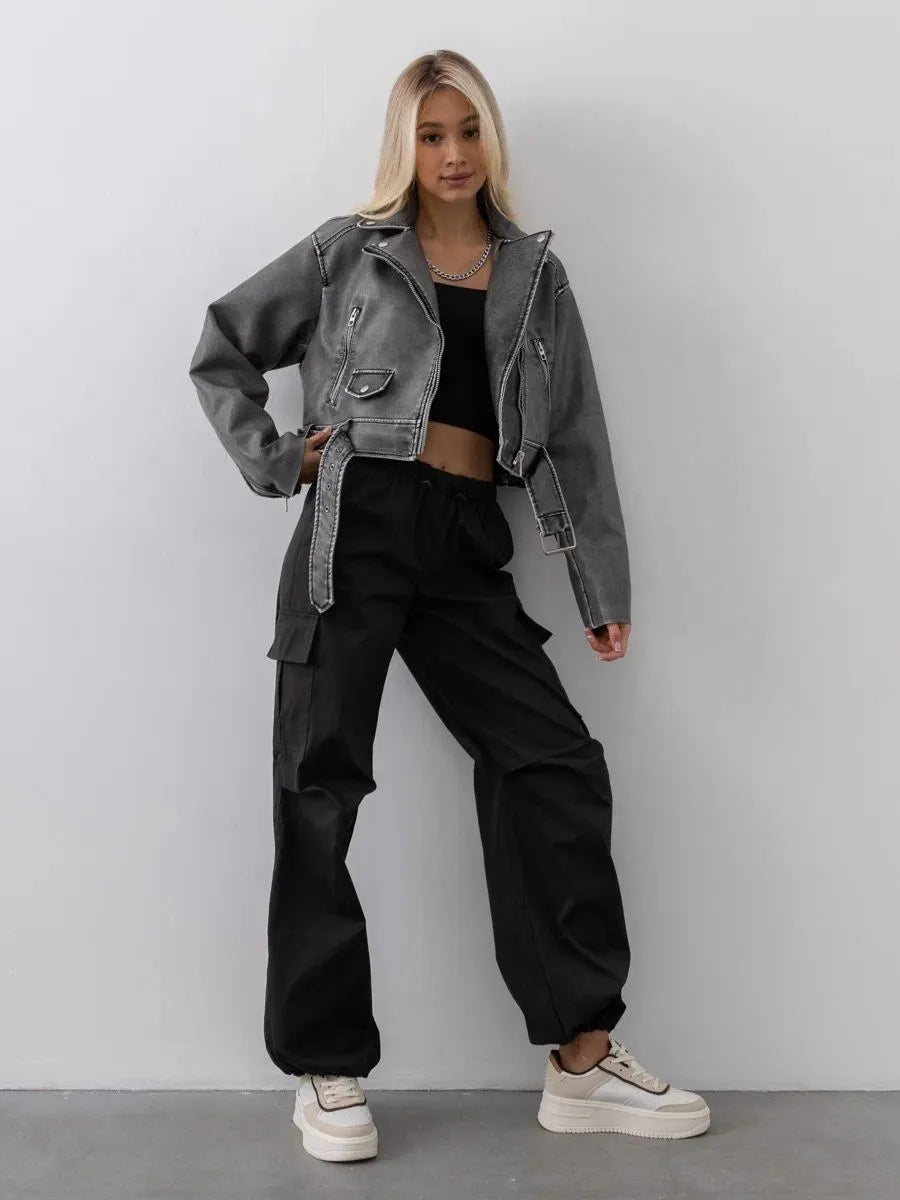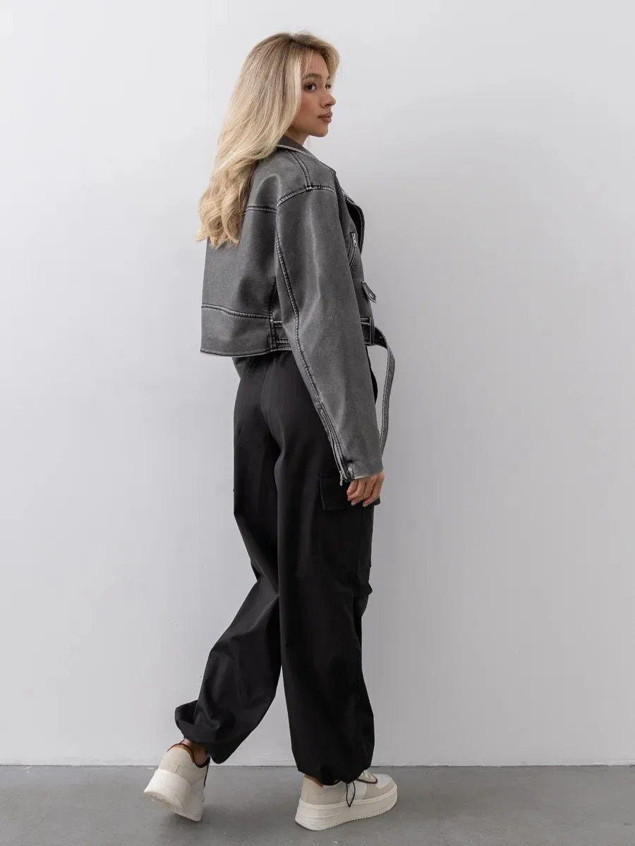 Oversize women's demi-season leather jacket with a straight cut with a sharp English collar is available in classic ink, pale beige and crystal black. This autumn biker jacket is made of premium monochromatic eco-leather and high-quality fittings.