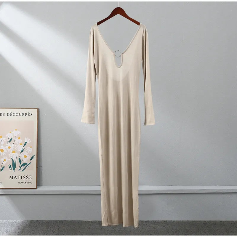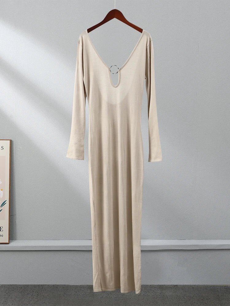 Low rise backless maxi dress with metal hoop center detail